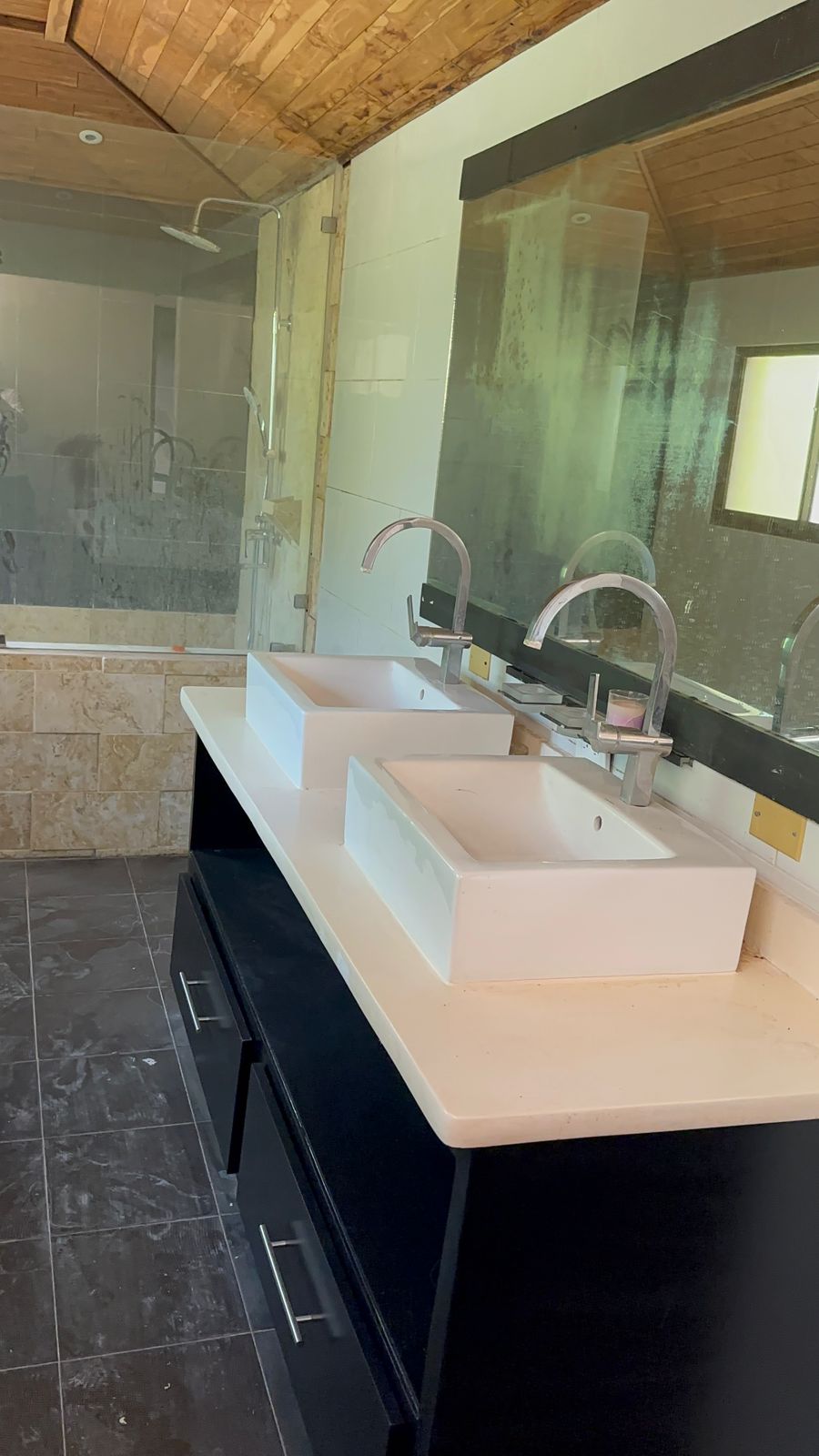 Techos inclinados de hormigón y tejas, muros de bloques de 6 con pañete liso interior y exterior, algunos muros en revestimiento en lajas de piedra, pisos de Cerámica y Porcelanato, ventanas panorámicas de Aluminio y Cristal, Puertas de Caobas.