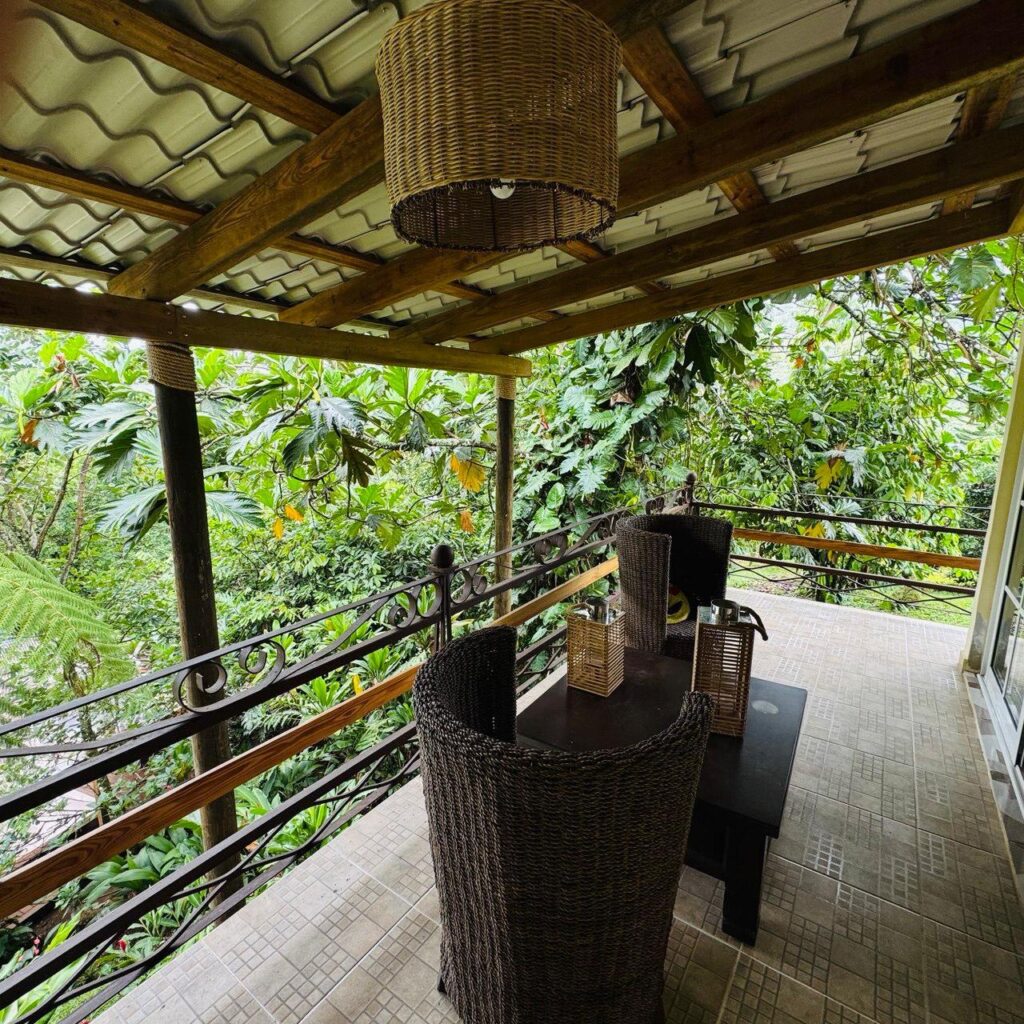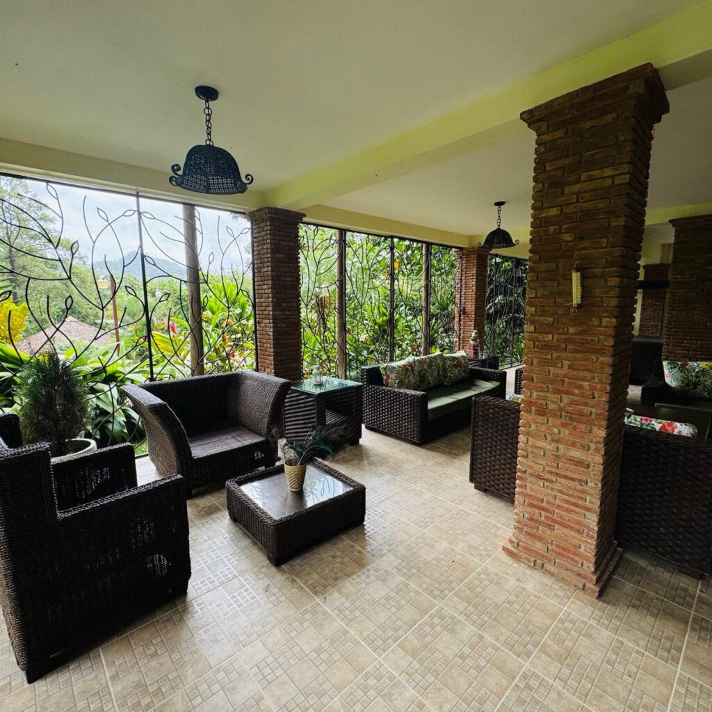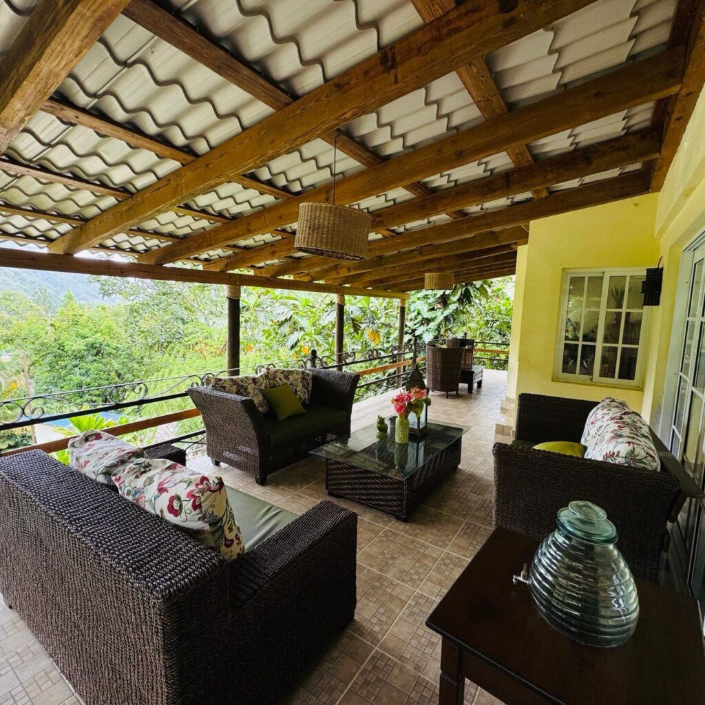 -Amplia terraza semiperimetral techada de madera y aluzinc tipo teja