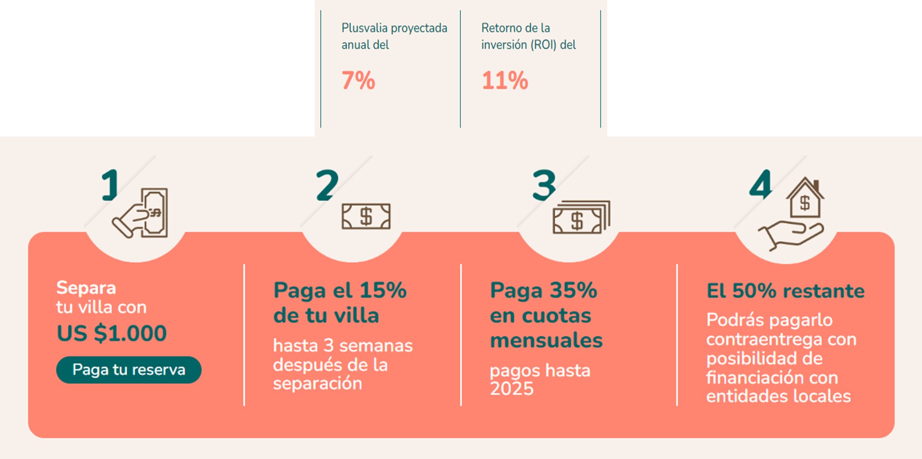 Es un proyecto de villas de inversión con ROI (Retorno de la inversión) esperado 11% EA* en dólares americanos y una Plusvalía Proyectada Anual del 7%.